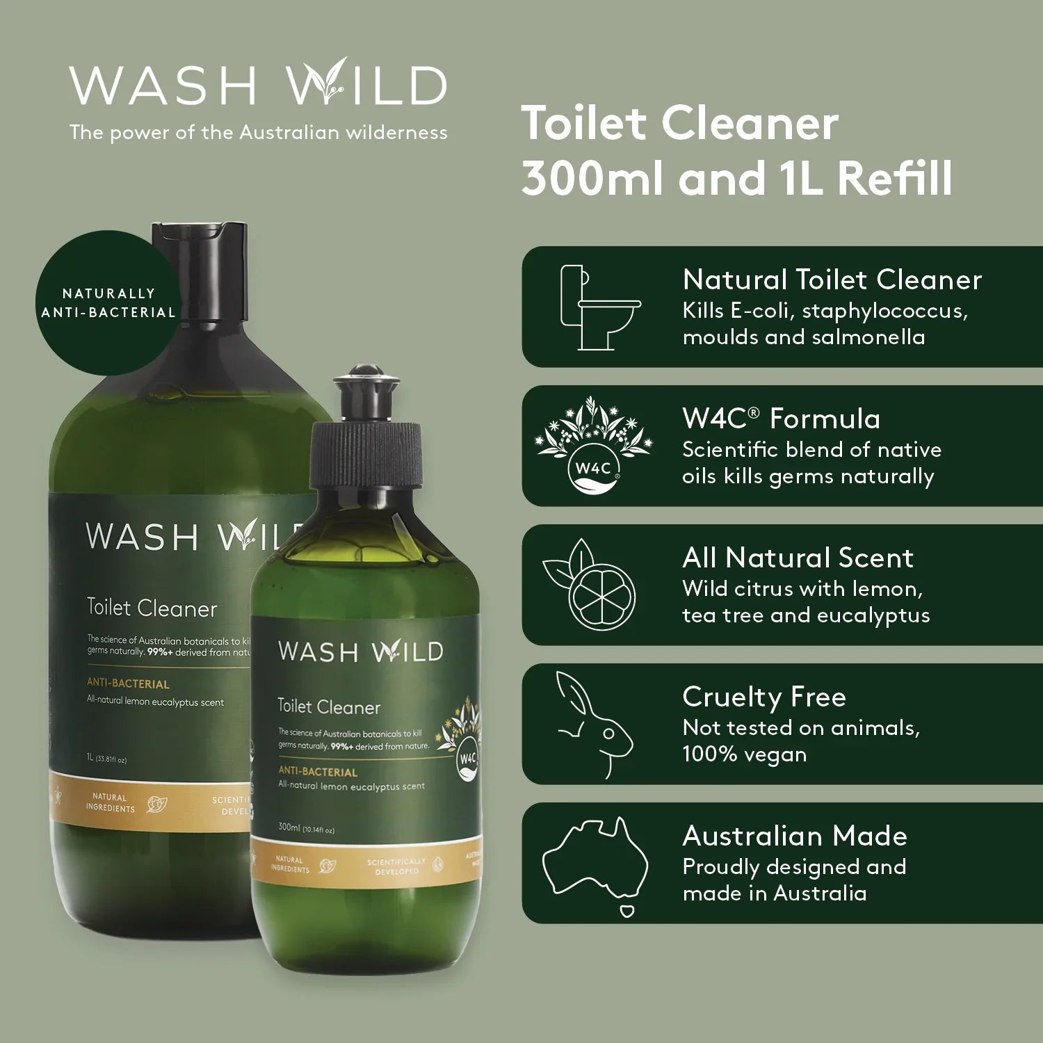 W4C® 澳洲原生植物油混合物具有高效的殺菌功效。每瓶 WASH WILD 都添加了 W4C®,其濃度已證實可有效殺死大腸桿菌、葡萄球菌、黴菌和沙門氏菌等細菌。