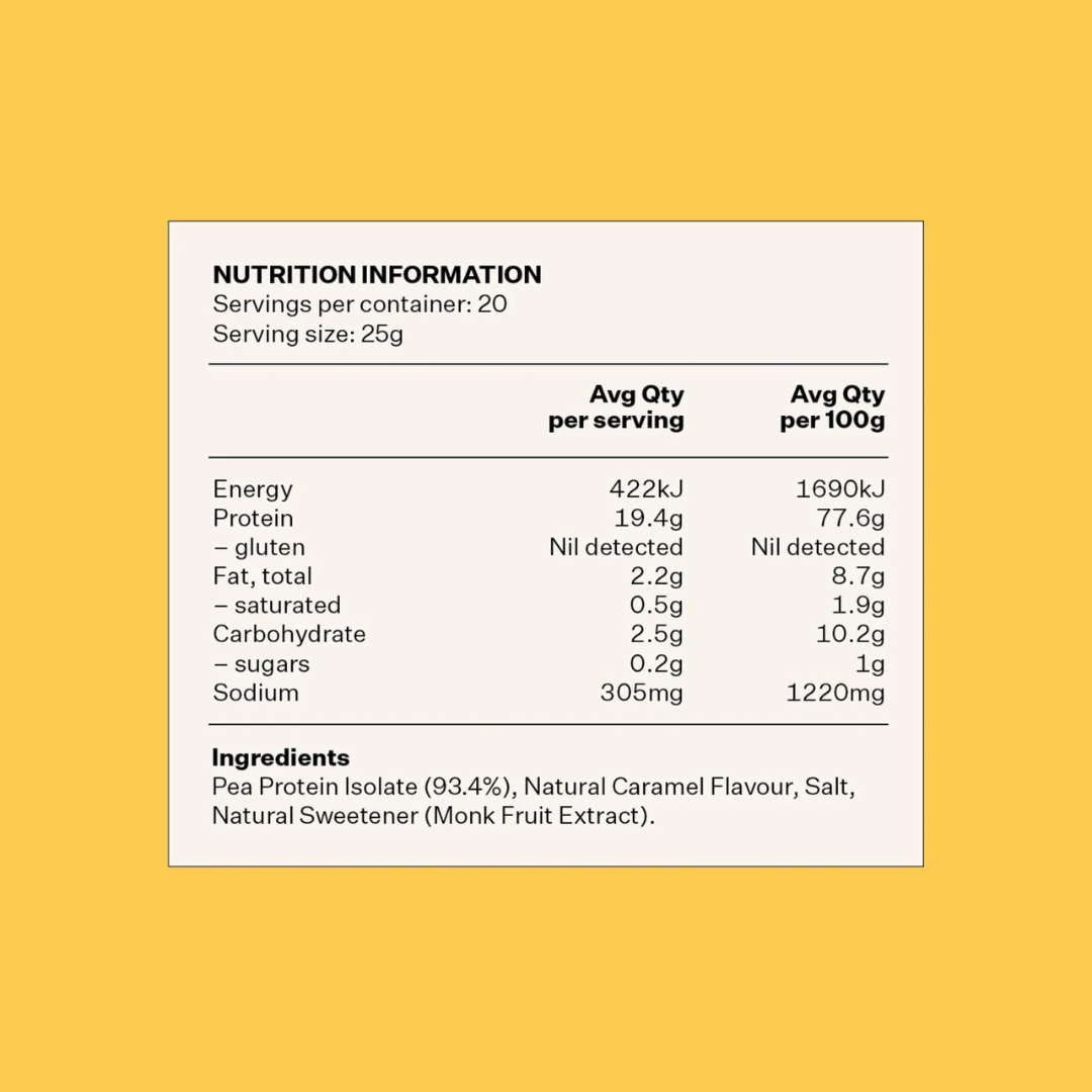 作為原材料的黃金豌豆種植於加拿大。鹽味焦糖味配方僅含 4 種成分,天然焦糖香氣和鹽味互相平衡,每份含超過 19 克蛋白質。