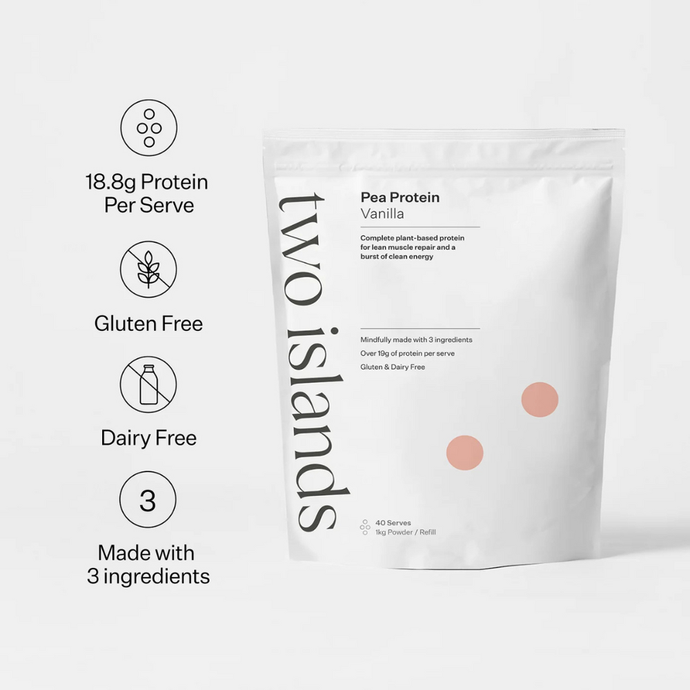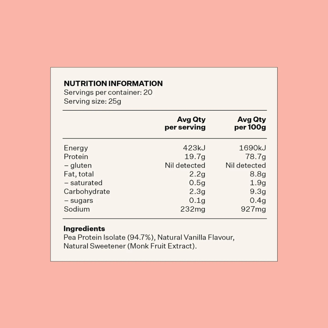 作為原材料的黃金豌豆種植於加拿大。雲呢拿味配方僅 3 種成分,每份含超過 19 克蛋白質。